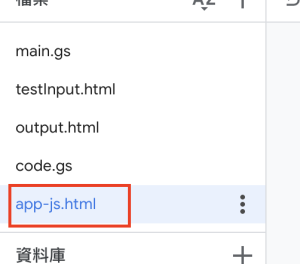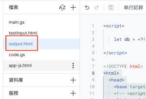 如果需要取用 google sheet 內的資料,則需要在 code.gs 中另外使用函式與資料表溝通。以下為範例。
