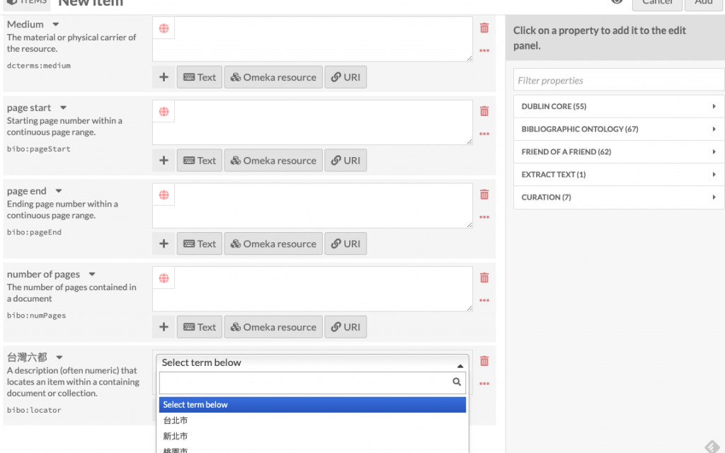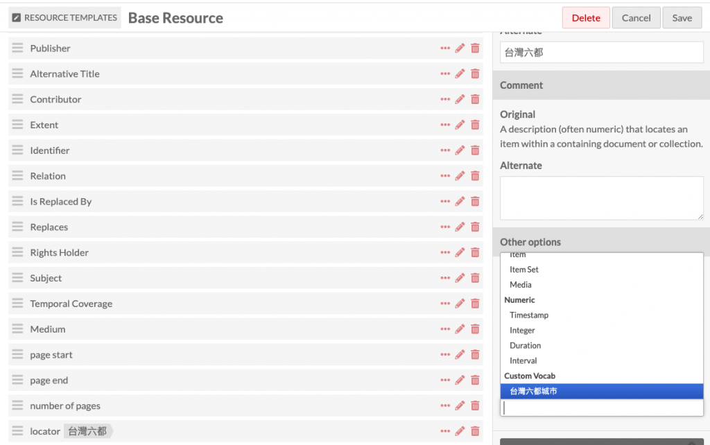 意思就是可以在資源範本中加入可以控制的詞彙資料,並且透過下拉式選單使用。簡單說就是在建立條目時,可以建立類似權威詞表的控制詞彙,限縮該欄位的資料內容。