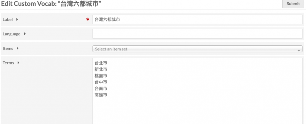 標籤(label)是必須填入的欄位,他會作為該詞表的顯示名稱。以上述例子來說,就是填入「台灣六都城市」。
