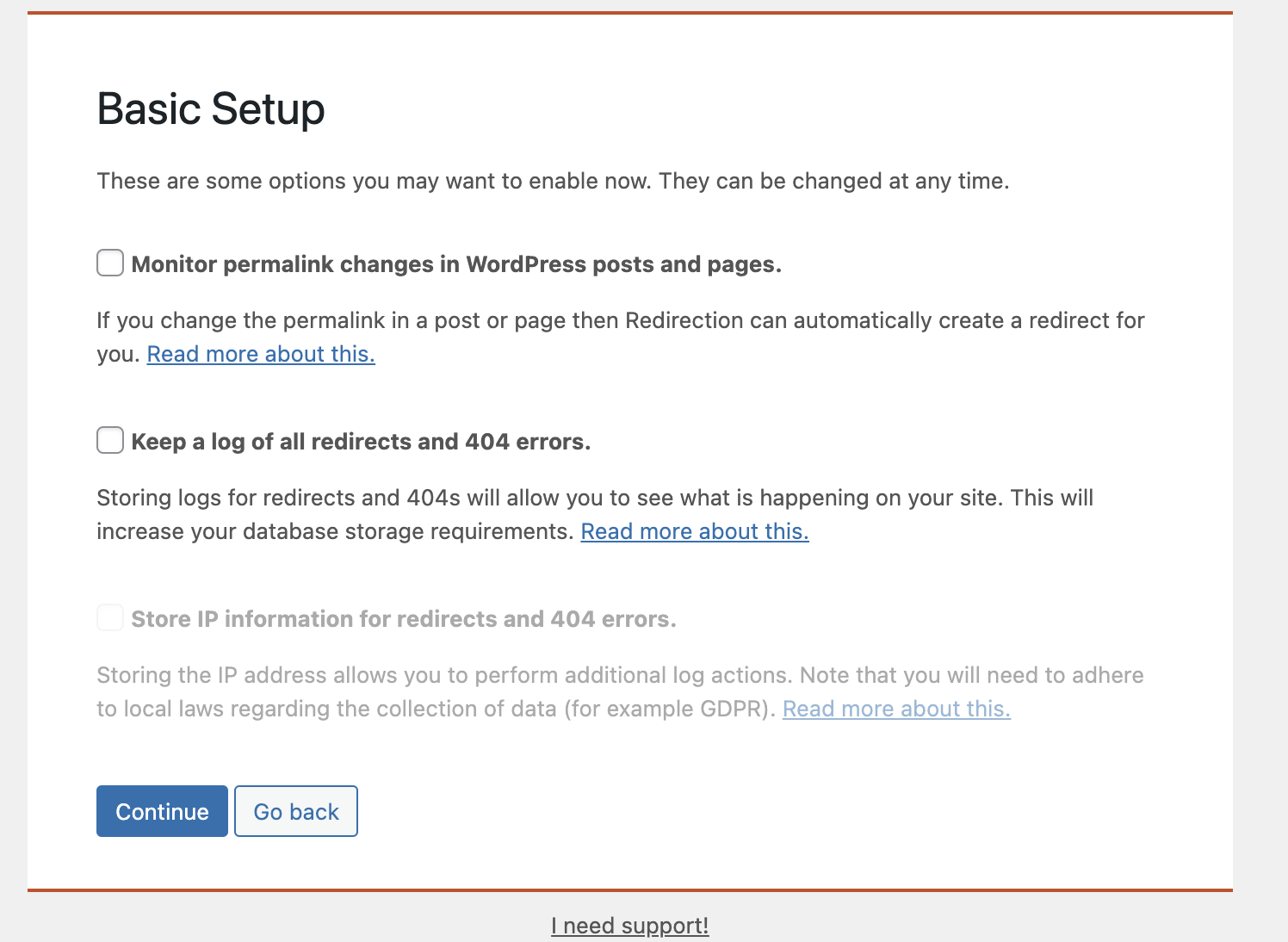 - Strore IP information for redirects and 404 error : 如果上面選項勾選後,就會挑出此選項,這個會順勢紀錄IP,但紀錄IP需要注意歐盟政策GDPR(如果你的網站是國際性最好注意),建議不清楚的話就別開。
